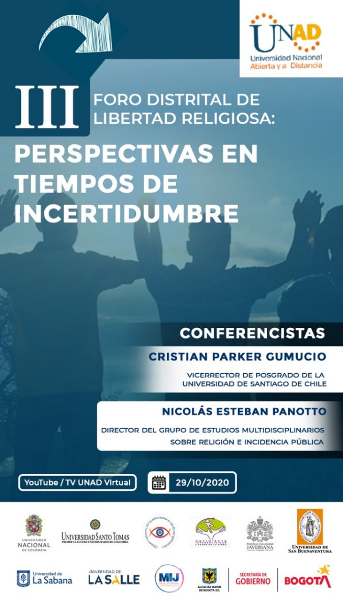 Ya están abiertas las inscripciones para el tercer Foro Distrital de Libertad Religiosa organizado por la Academia, con el apoyo de la Secretaría de Gobierno, que para este año se centrará en las Perspectivas en tiempos de incertidumbre. El encuentro se desarrollará de manera virtual el próximo 29 de octubre y quienes quieran asistir podrán hacerlo ingresando al enlace https://bit.ly/3hcdhRF y diligenciando el formulario de inscripción.