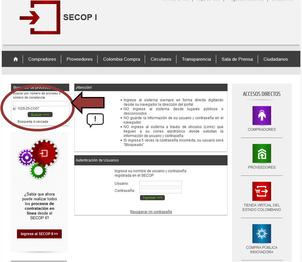 Señor ciudadano para la consulta del proceso dar clic en el siguiente vinculo: https://www.contratos.gov.co/entidades/entLogin.html, y podrá digitar el numero de la constancia que encontrará en el siguiente documento adjunto y que podrá digitar en el sitio web de acuerdo con la gráfica adjunta.